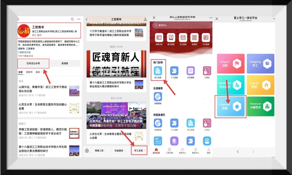 关注工贸青年公众号—>点击发消息,选择学工系统—>登陆后点击热门应用里的学工系统—>选择团委—>点击活动参与—>确认报名“9.3阅兵武器装备大揭秘讲座”活动,状态显示已报名即可。
